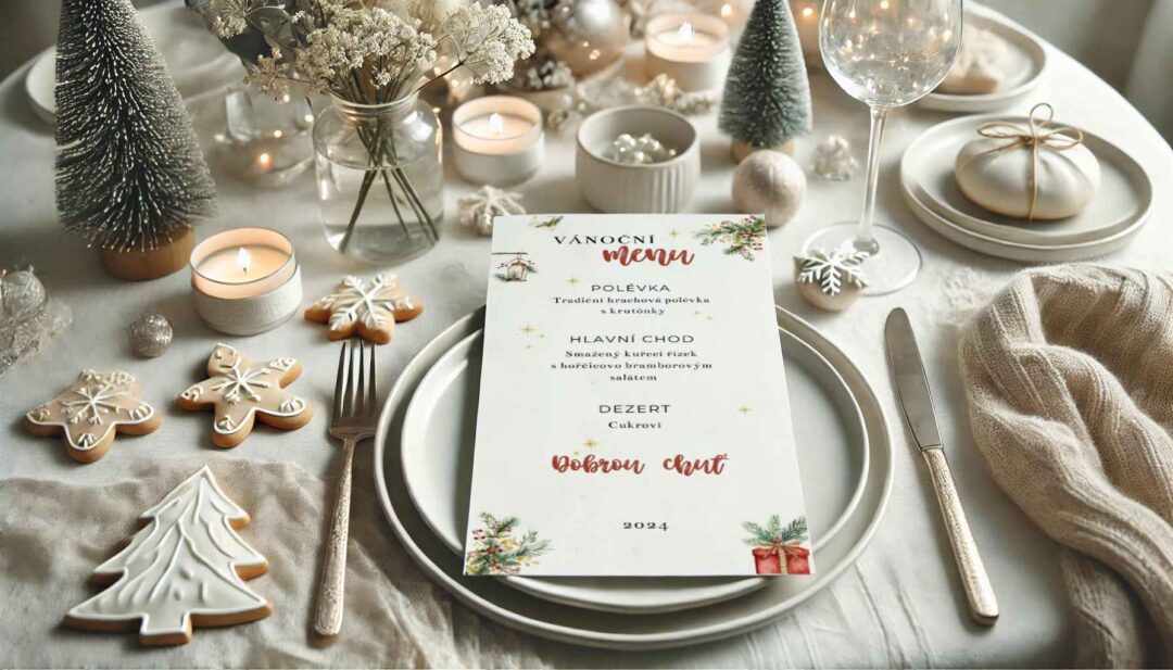 Vytvořte si vkusné štědrovečerní menu během pár minut o ozdobte s ním váš stůl.  Vše již od nás budete mít připraveno. Vy tak jen doplníte pokrmy, doladíte nejvhodnější barvu menu a jednoduše vytisknete. S objednávkou od nás dostanete editovatelnou šablonu v několika barevných provedeních.